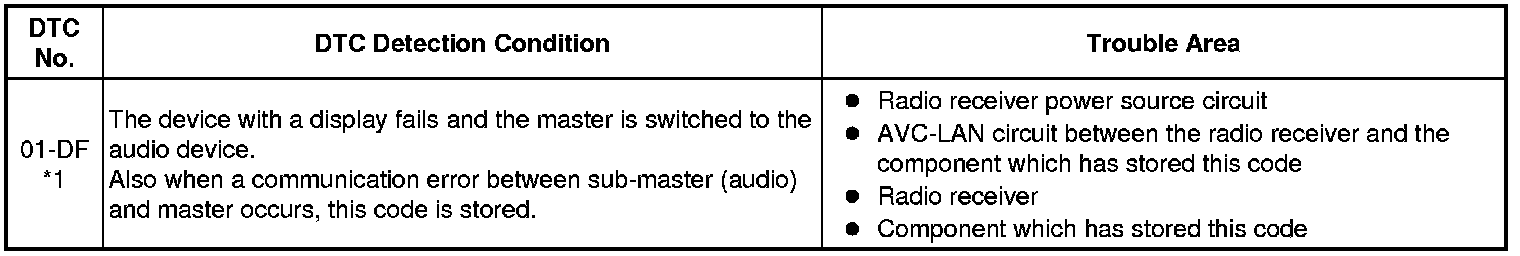 *1: When 210 seconds have elapsed after disconnecting the power supply connector of the master component with the ignition switch on (ACC or IG), this code is stored.