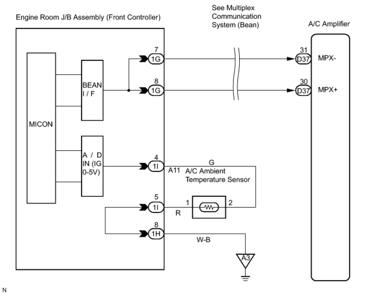 The sensor connected to the engine room J/B assembly (front controller) detects fluctuations in the ambient temperature that is used for controlling the interior temperature. The sensor sends a to the A/C amplifier via the engine room J/B assembly (front controller).