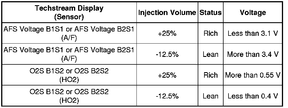 Malfunctioning areas can be identified by performing the Control the Injection Volume for A/F Sensor function provided in the Active Test. The Control the Injection Volume for A/F Sensor function can help to determine whether the Air-Fuel Ratio (A/F) sensor, Heated Oxygen (HO2) sensor and other potential trouble areas are malfunctioning.
