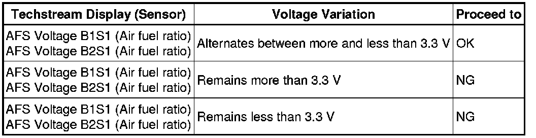 A normal heated oxygen sensor voltage (O2S B1S2 or O2S B2S2) reacts in accordance with increases and decreases in fuel injection volumes. When the air fuel ratio sensor voltage remains at either less or more than 3.3 V despite the heated oxygen sensor indicating a normal reaction, the air fuel ratio sensor is malfunctioning.