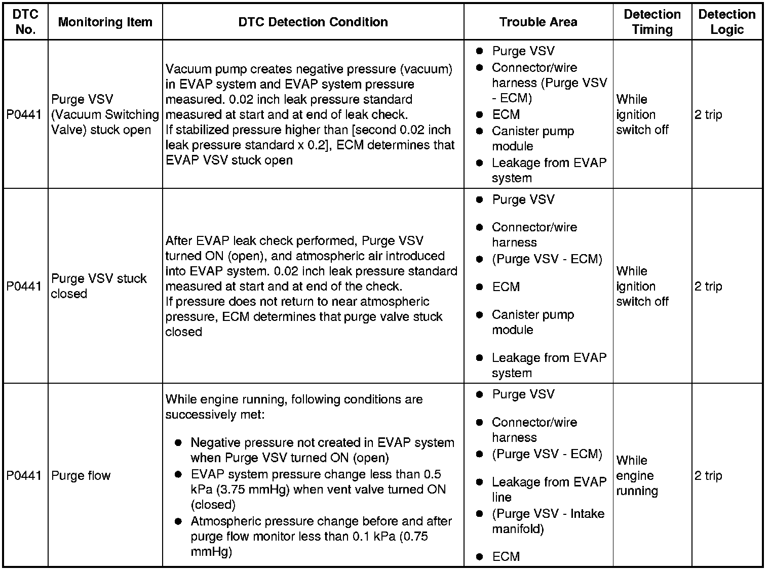 * The vent valve is turned ON (closed) and the EVAP pressure is then measured. If the variation in the pressure is less than 0.4 kPa (3 mmHg), the ECM interprets this as the Purge VSV being stuck closed, and illuminates the MIL and sets DTC P0441 (2 trip detection logic).