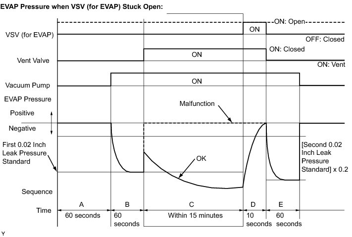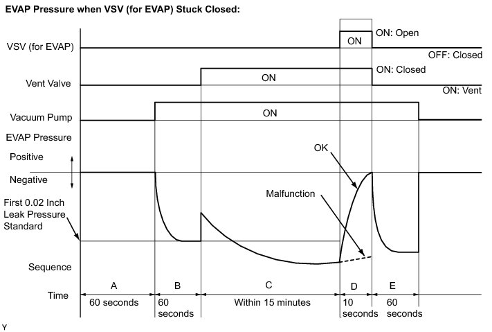 In operation C, the vacuum pump creates negative pressure (vacuum) in the EVAP (Evaporative Emission) system. The EVAP system pressure is then measured by the ECM using the pressure sensor. If the stabilized system pressure is higher than [second 0.02 inch leak pressure standard x 0.2], the ECM interprets this as the Purge VSV (Vacuum Switching Valve) being stuck open. The ECM illuminates the MIL and sets the DTC (2 trip detection logic).