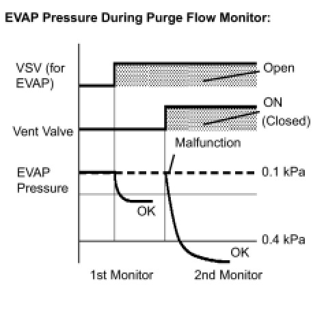 * While the engine is running and the Purge VSV (Vacuum Switching Valve) is ON (open), the ECM monitors the purge flow by measuring the EVAP pressure change. If negative pressure is not created, the ECM begins the 2nd monitor.