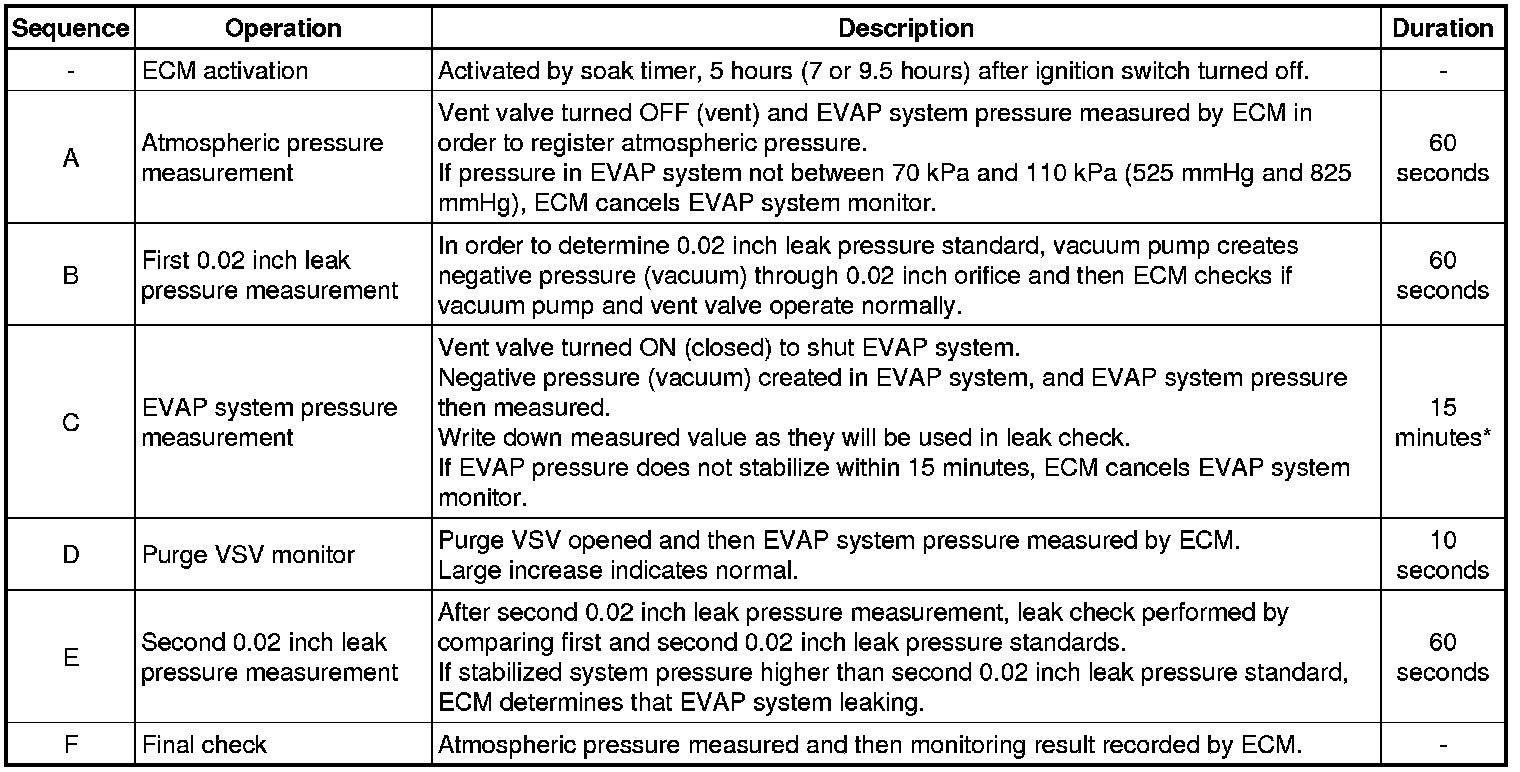 * In operation C, the vacuum pump creates negative pressure (vacuum) in the EVAP system and the EVAP system pressure is measured. If the stabilized system pressure is higher than the second 0.02 inch leak pressure standard, the ECM determines that the EVAP system has a small leak, illuminates the MIL and sets the DTC (2 trip detection logic).