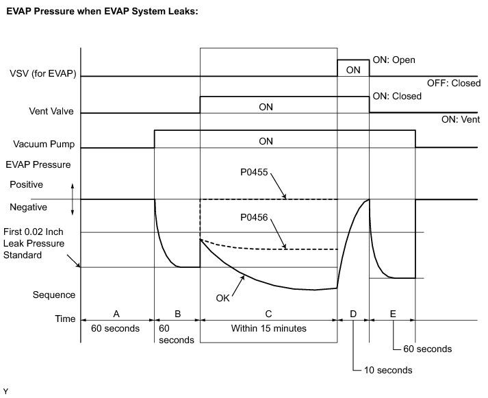 * In operation C, the vacuum pump creates negative pressure (vacuum) in the EVAP system and the EVAP system pressure is measured. If the stabilized system pressure is higher than [second 0.02 inch leak pressure standard x 0.2] (near atmospheric pressure), the ECM determines that the EVAP system has a large leak, illuminates the MIL and sets the DTC (2 trip detection logic).