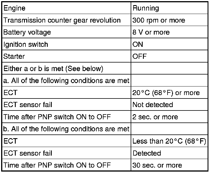 The TCM assumes that the vehicle is being driven when the transmission counter gear indicates more than 300 rpm and over 30 seconds have passed since the park/neutral position switch was turned off. If there is no signal from the vehicle speed sensor with these conditions satisfied, the TCM concludes that the vehicle speed sensor is malfunctioning. The TCM will turn on the MIL and a DTC will be set.