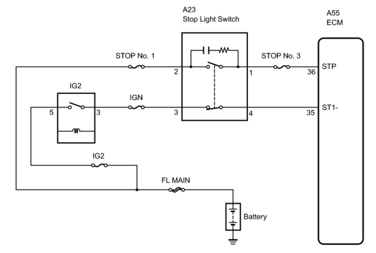 When the brake is applied, battery voltage is normally applied to terminal STP of the ECM through the STOP fuse and the stop light switch assembly, and the ECM turns the cruise control off.