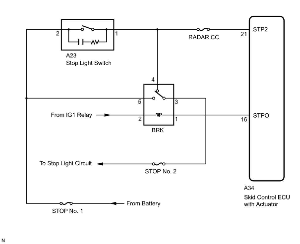 The skid control ECU operates the brake actuator and illuminations the stop light by operating the BRK relay at the same time.