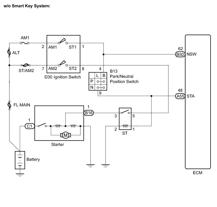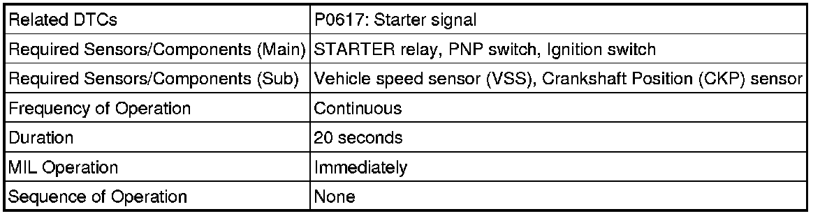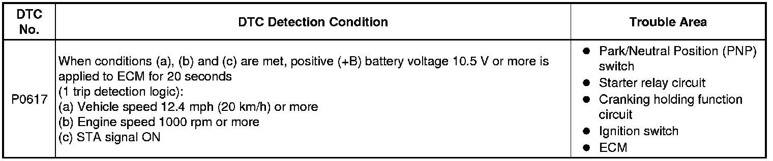 If the ECM detects the Starter Control (STA) signal while the vehicle is being driven, it determines that there is a malfunction in the STA circuit. The ECM then illuminates the MIL and sets the DTC.