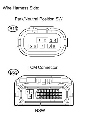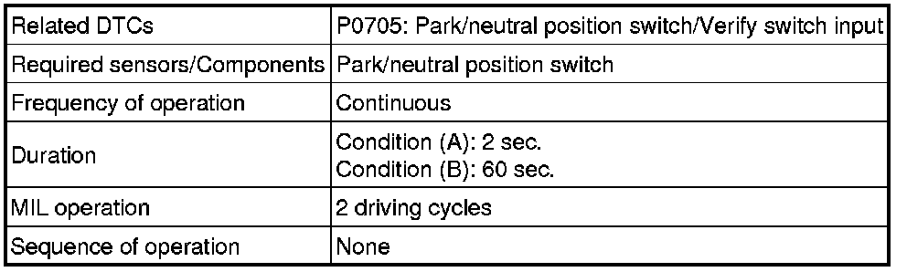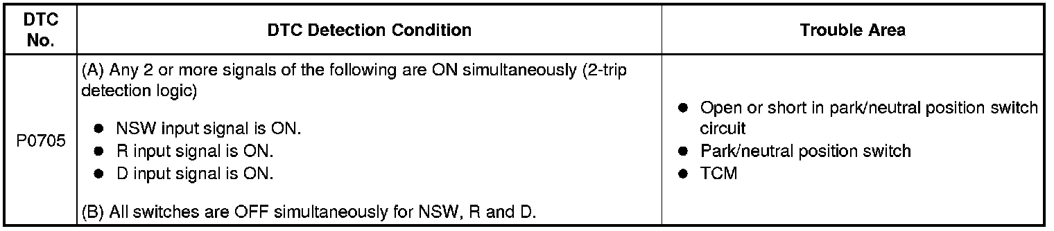 The park/neutral position switch sends a signal to the TCM according to the shift lever position (R or D). The TCM determines that there is a problem with the switch or related parts if it receives more than 1 position signal simultaneously. The TCM will turn on the MIL and store the DTC.