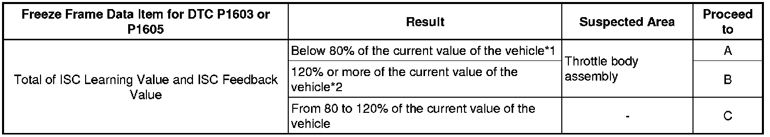 - *1: If the throttle body assembly has a temporary problem in which it cannot fully close, the intake air volume and engine speed increase. As a result, the ISC learning amount becomes less than the standard. At this time, if the throttle body assembly returns to normal and fully closes, the intake air volume will be insufficient and the engine may stall.