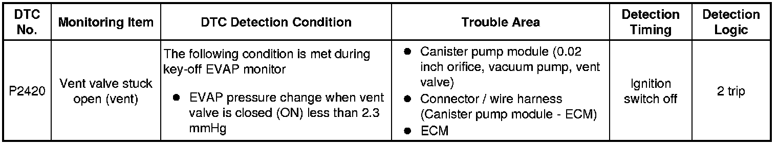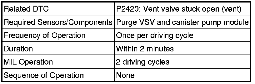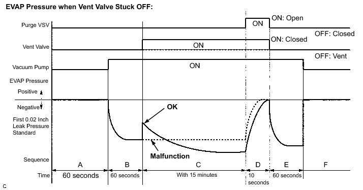 The vent valve turns ON (closes) and the EVAP (Evaporative Emission) system pressure is then measured by the ECM, using the pressure sensor, to conduct an EVAP leak check. If the pressure does not increase when the vent valve is open, the ECM interprets this as the vent valve being stuck open. The ECM illuminates the MIL and sets the DTC.