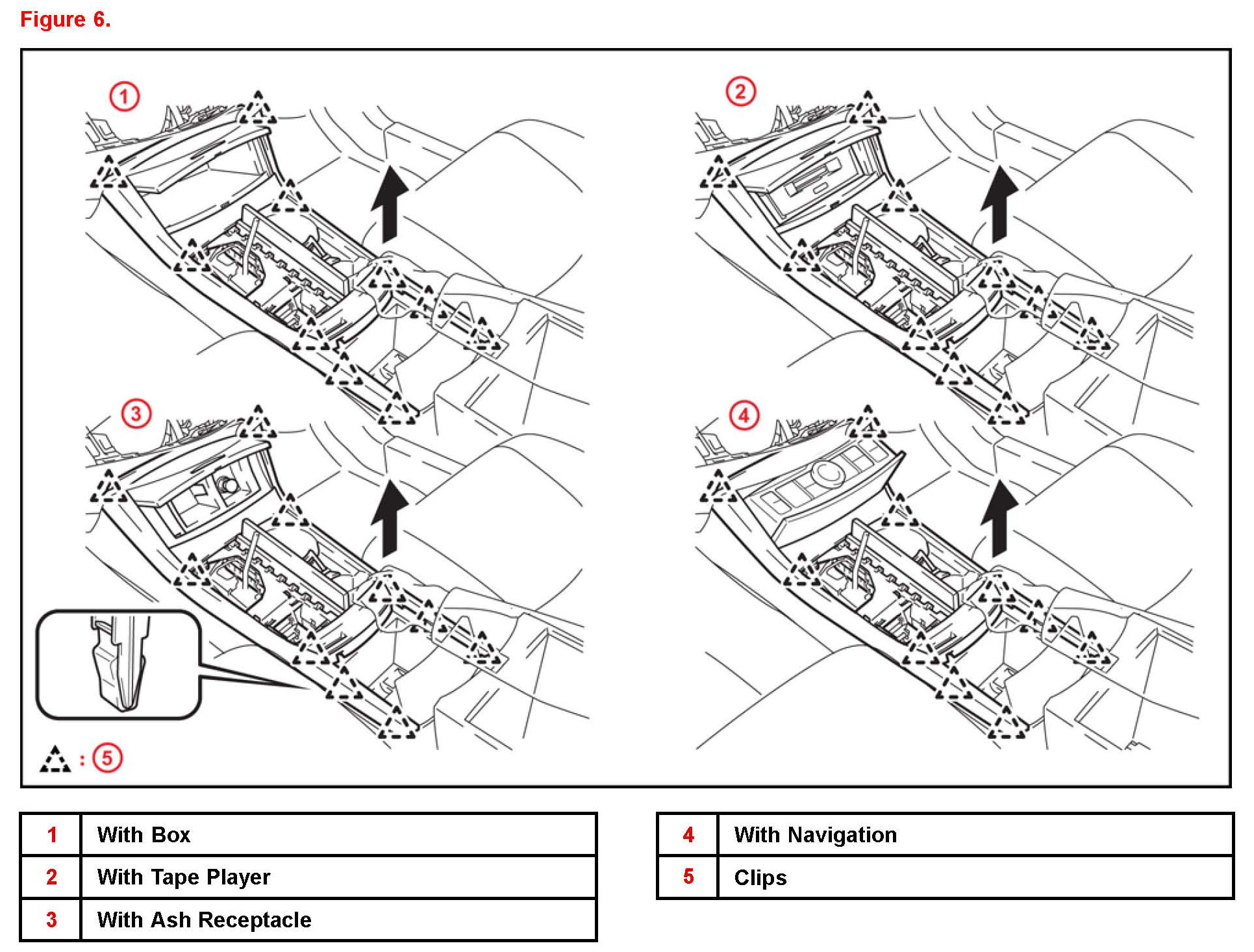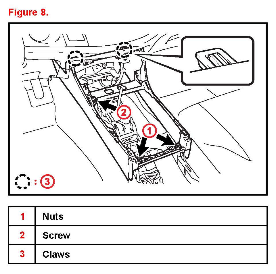 A. Disengage the 6 claws and remove the console upper box (if equipped).