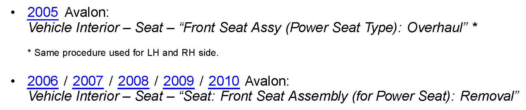 Refer to TIS applicable model year Avalon Repair Manual: