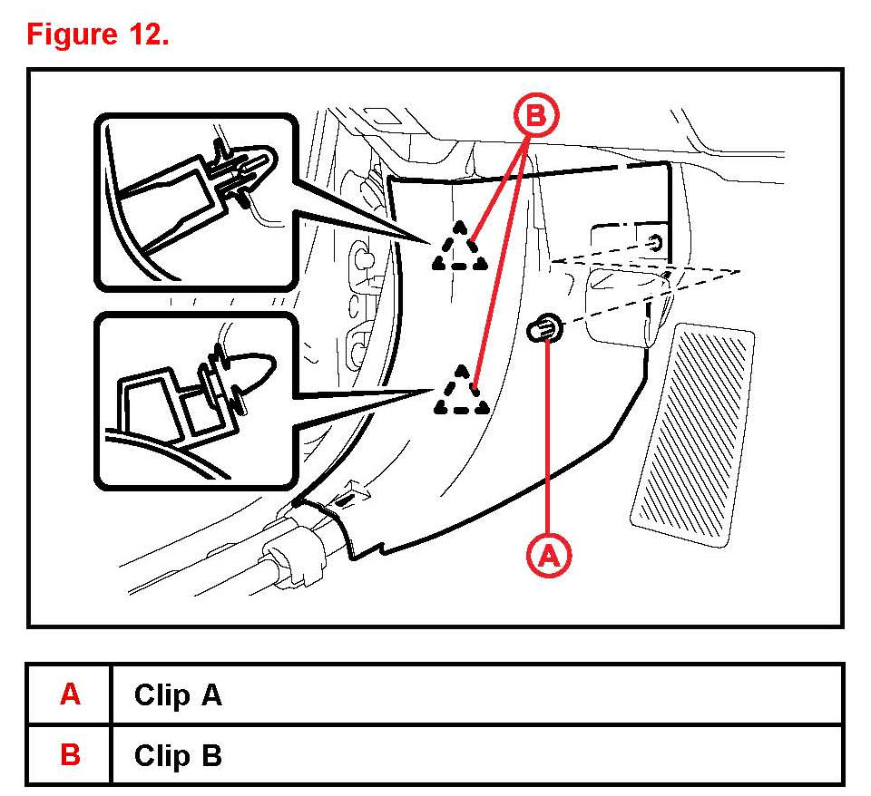 15. Remove the clip (A) and disengage the 2 clips (B) and remove the cowl side trim sub-assembly LH.
