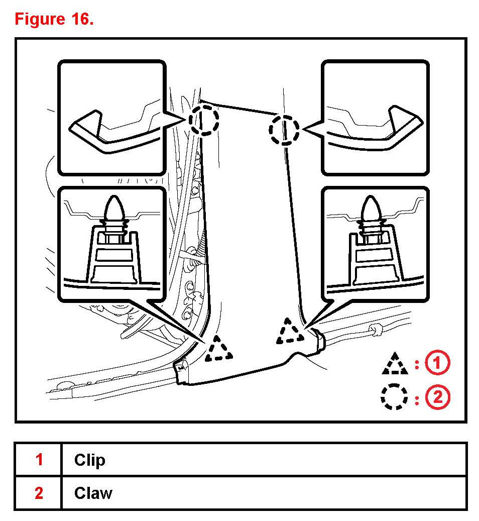 26. Disengage the 2 clips and 2 claws and remove the center pillar lower garnish RH.