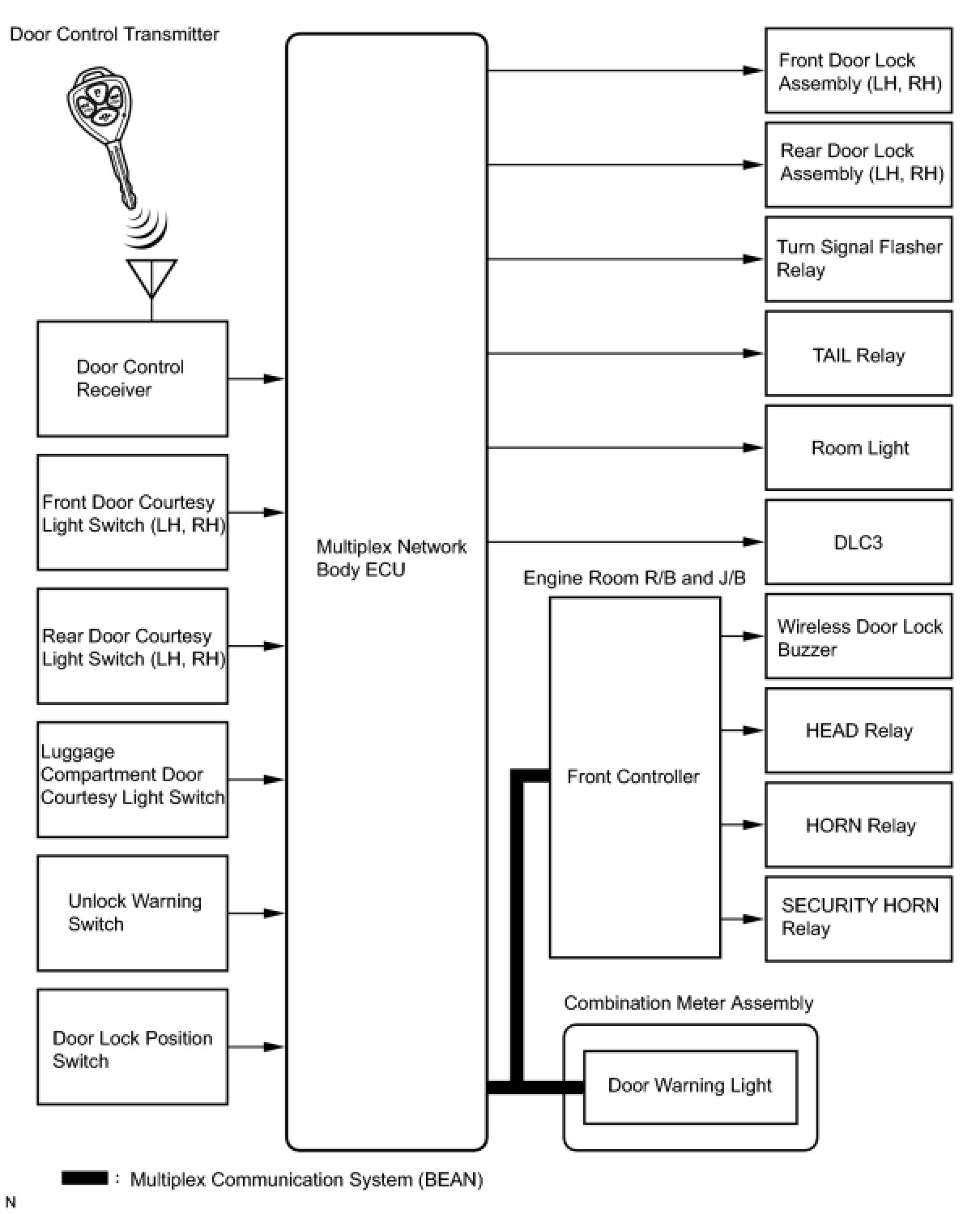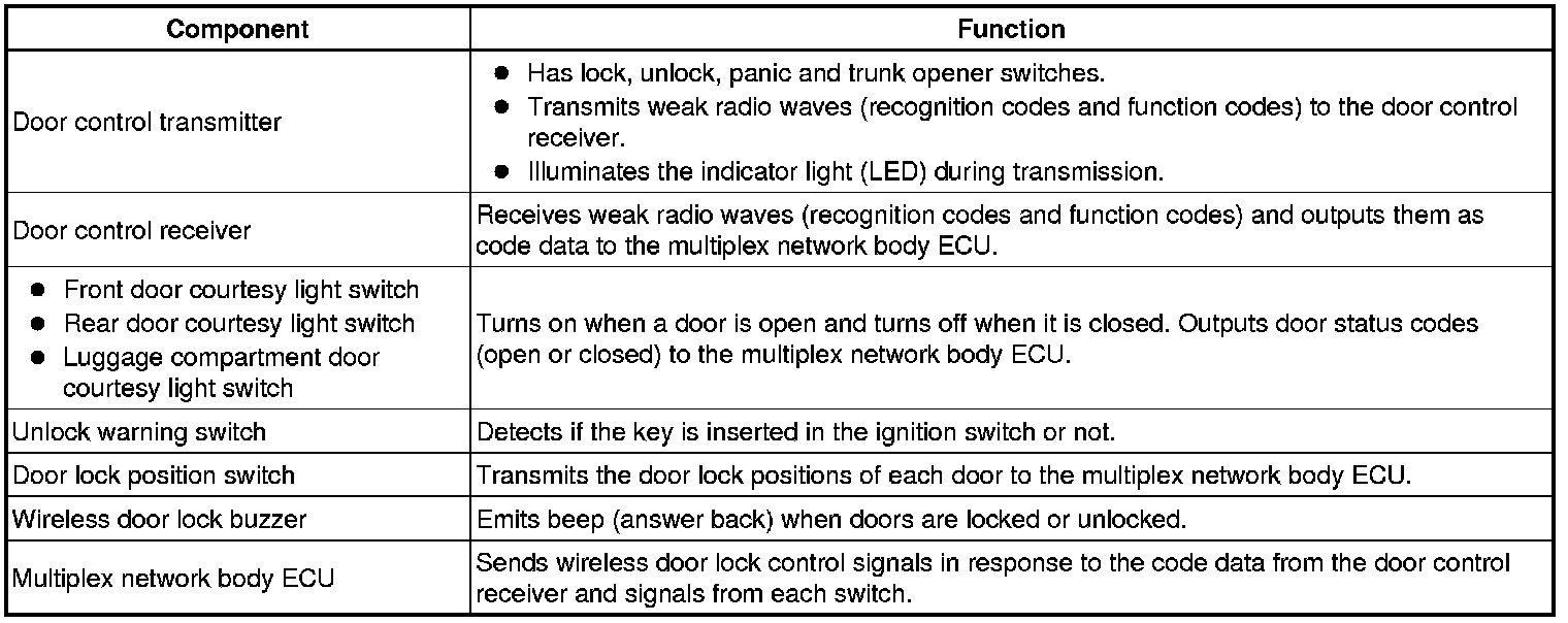 (a) The wireless door lock control system functions to lock and unlock all the doors from a distance. The system is controlled by an intelligent transmitter which sends radio waves to the door control receiver. The multiplex network body ECU performs an ID code identification process and engages the door lock control.