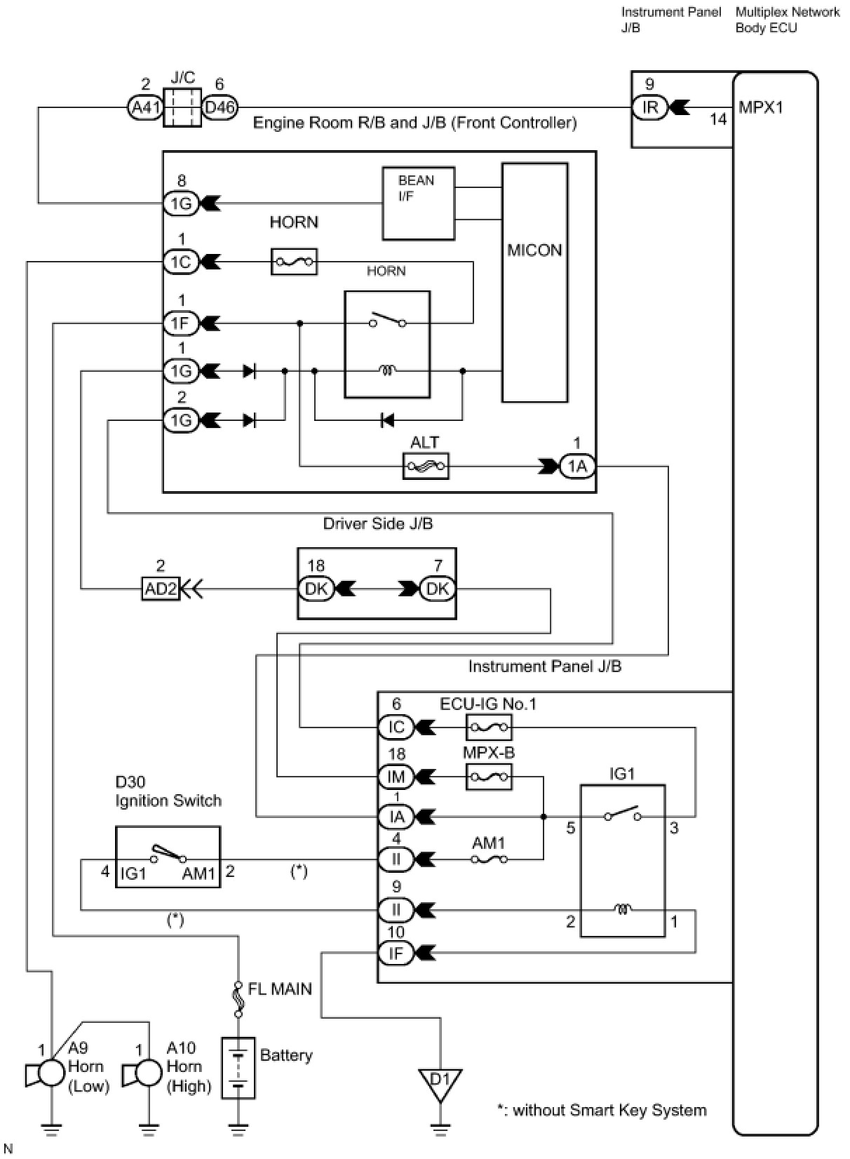 The horn circuit uses BEAN for communication. If there are any malfunctions in this circuit, check for DTCs in the multiplex communication system Reading and Clearing Diagnostic Trouble Codes.