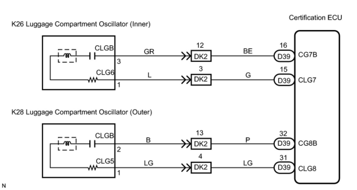 The certification ECU activates the inner and outer luggage compartment oscillators. The power is supplied from the certification ECU to both the inner and outer luggage compartment oscillators. The inner and outer luggage compartment oscillator circuits have the same wiring. If the entry luggage compartment function has a malfunction, check the circuit for the malfunctioning oscillator.