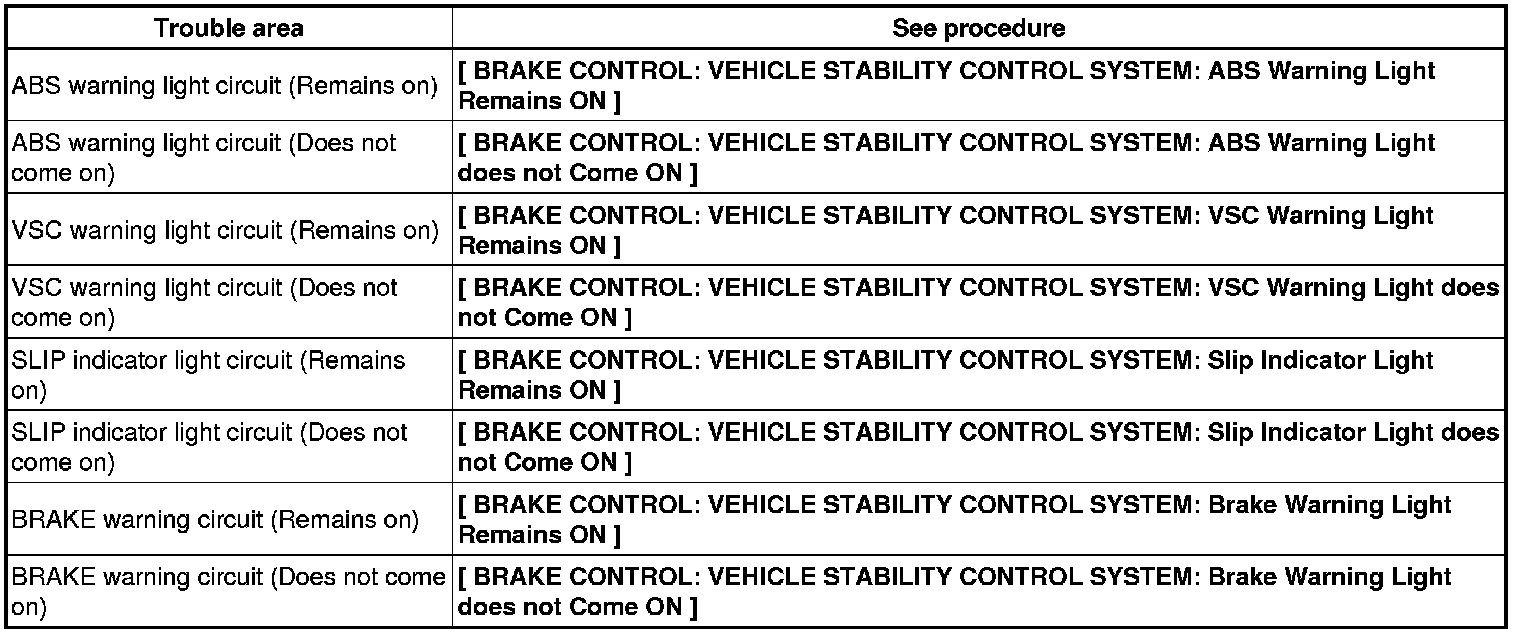 If the skid control ECU stores any DTCs, the ABS warning light, VSC warning light and SLIP indicator light come on.