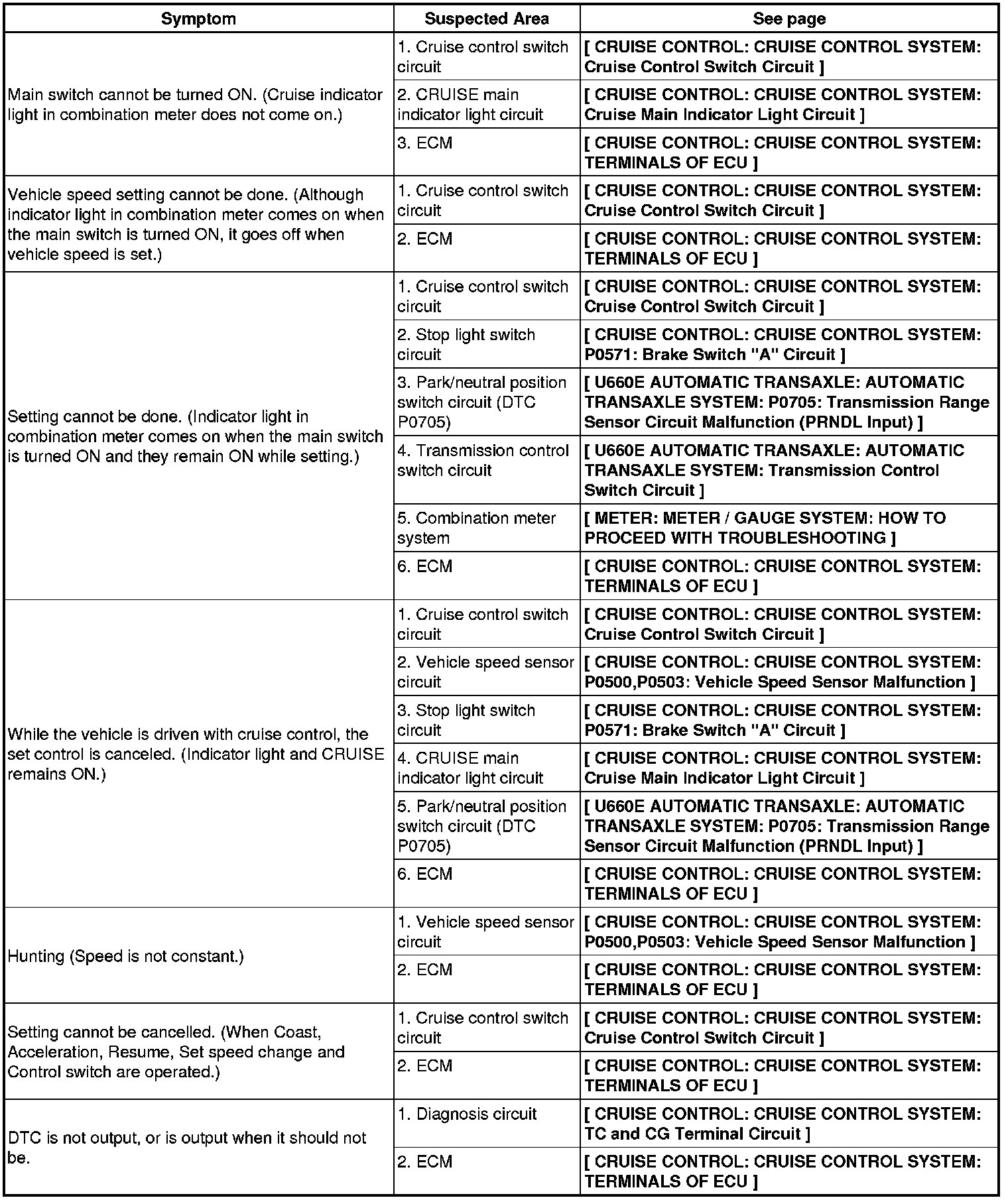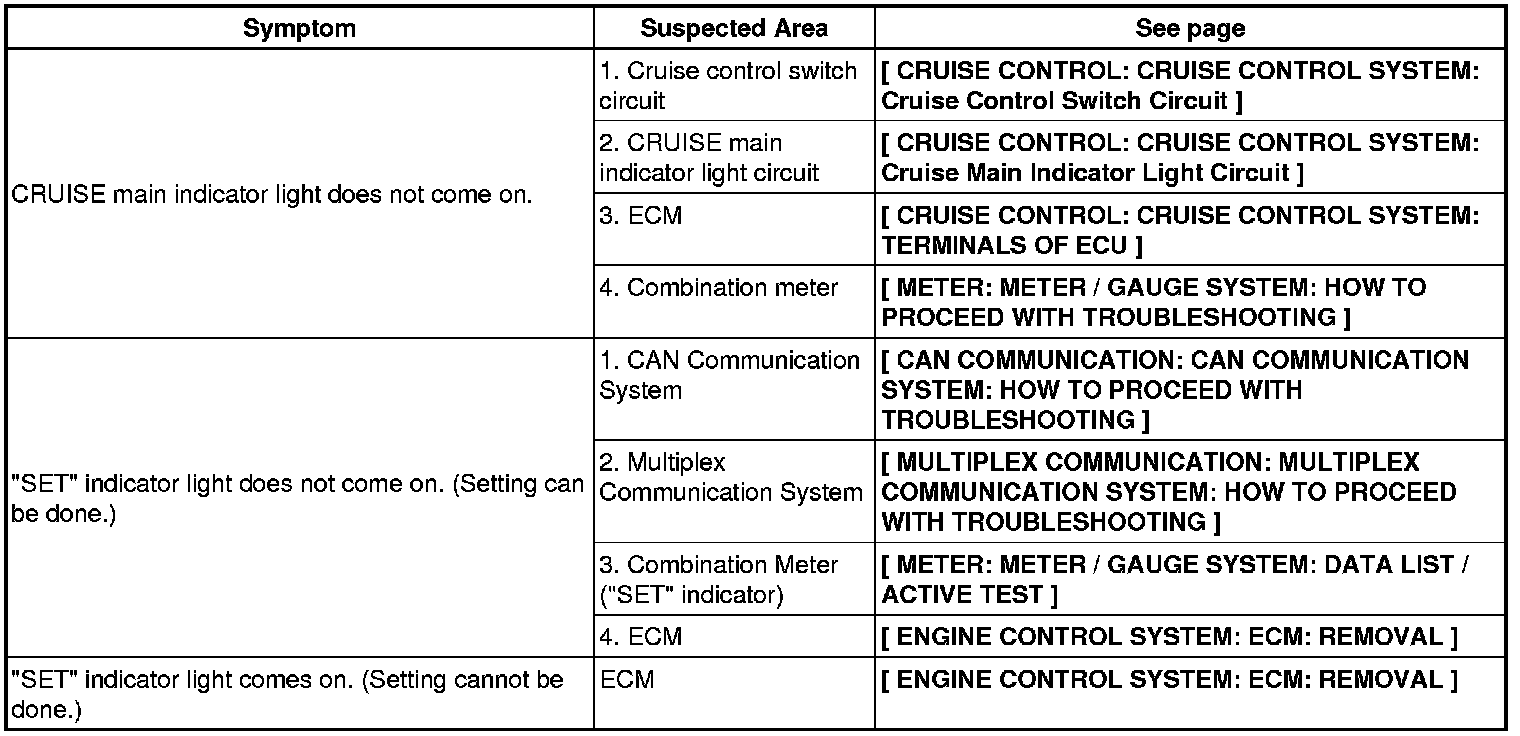 CRUISE CONTROL: CRUISE CONTROL SYSTEM: PROBLEM SYMPTOMS TABLE