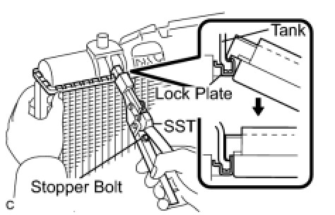 (a) Lightly tap the bracket of the radiator (or radiator hose inlet or outlet) with a soft-faced hammer and remove the tank.