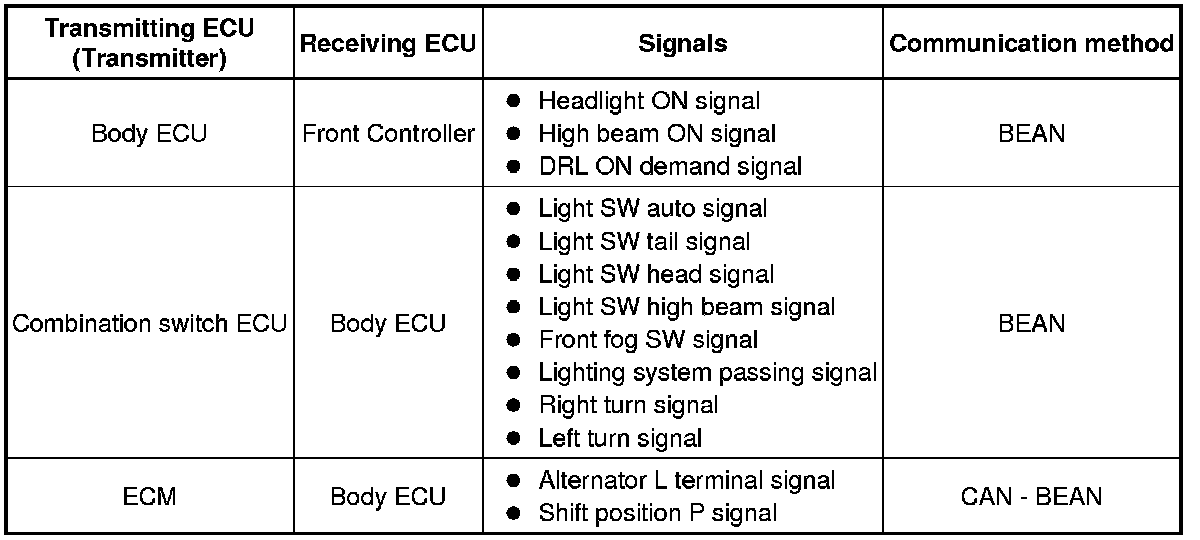 (4) The front controller receives headlight ON and the high beam ON signals from the body ECU, and then controls the illuminating period of the following based on the signal listed in "D":