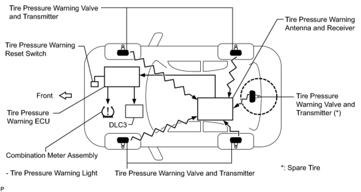 (a) Each tire pressure warning valve and transmitter is equipped with a tire pressure sensor and a transmitter and is installed in each tire and wheel assembly. The sensor measures the tire pressure. The measured value and transmitter ID are transmitted to the tire pressure warning antenna and receiver on the body as radio waves and then sent to the tire pressure warning ECU from the tire pressure warning antenna and receiver. If the transmitter ID has already been registered, the ECU compares the measured air pressure value with the standard value. When the value is less than the standard value registered in the tire pressure warning ECU, the warning light on the combination meter comes on.