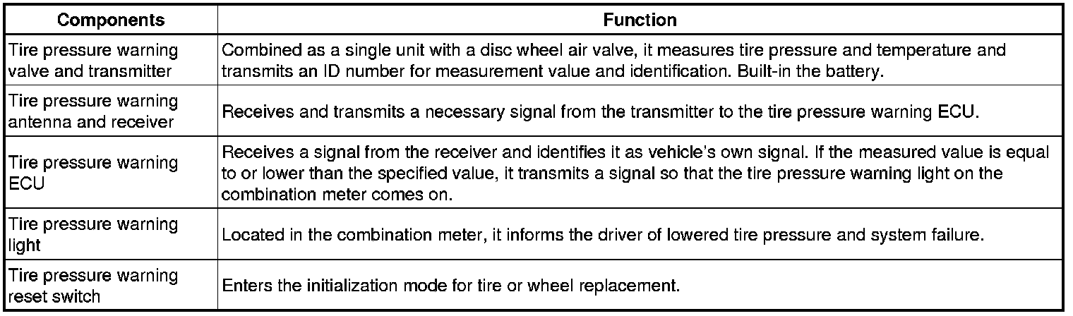 * During initialization, the tire pressure warning valve and transmitter measures the inflation pressure of the tires, and registers the signals that are transmitted into the tire pressure warning ECU at a frequency of once per minute. The initialization process is completed when signals from the all tires (including the spare tire) have been received.