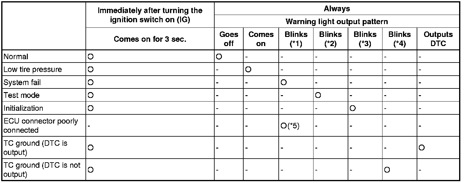 The table below indicates the state of the tire pressure warning light and indicator after the ignition switch is turned on (IG).