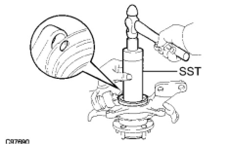 (a) Using SST and a press, install a new front axle hub LH bearing to the steering knuckle LH.