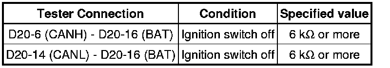 There may be a short circuit between the CAN bus line and +B when there is resistance between terminals 6 (CANH) and 16 (BAT), or terminals 14 (CANL) and 16 (BAT), of the DLC3.