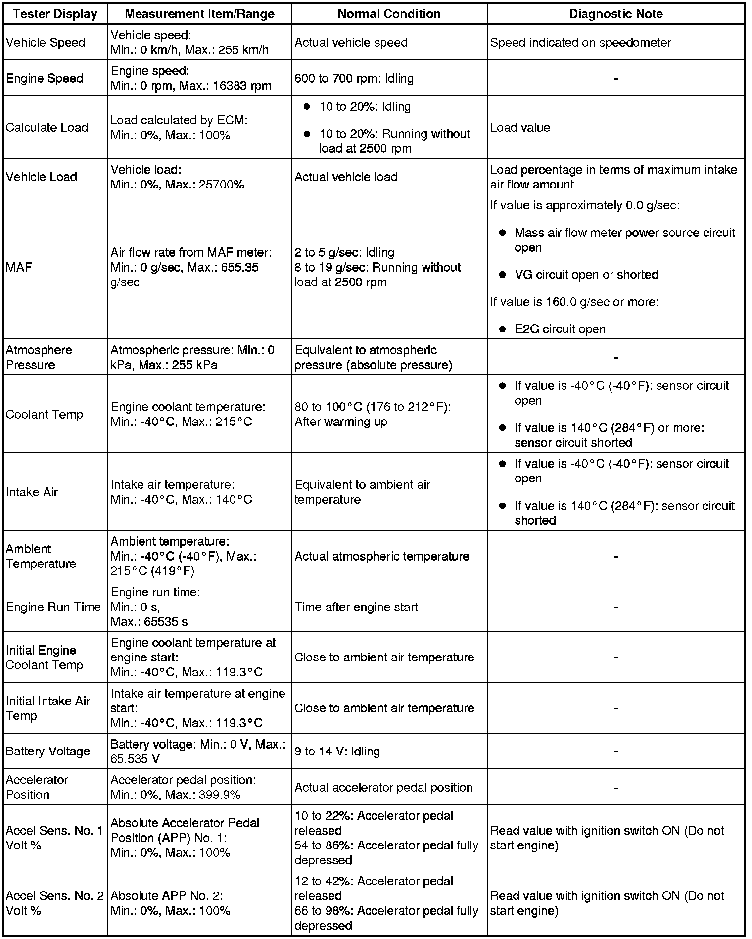 In the table below, the values listed under Normal Condition are reference only. Do not depend solely on these values when determining whether or not a part is faulty.