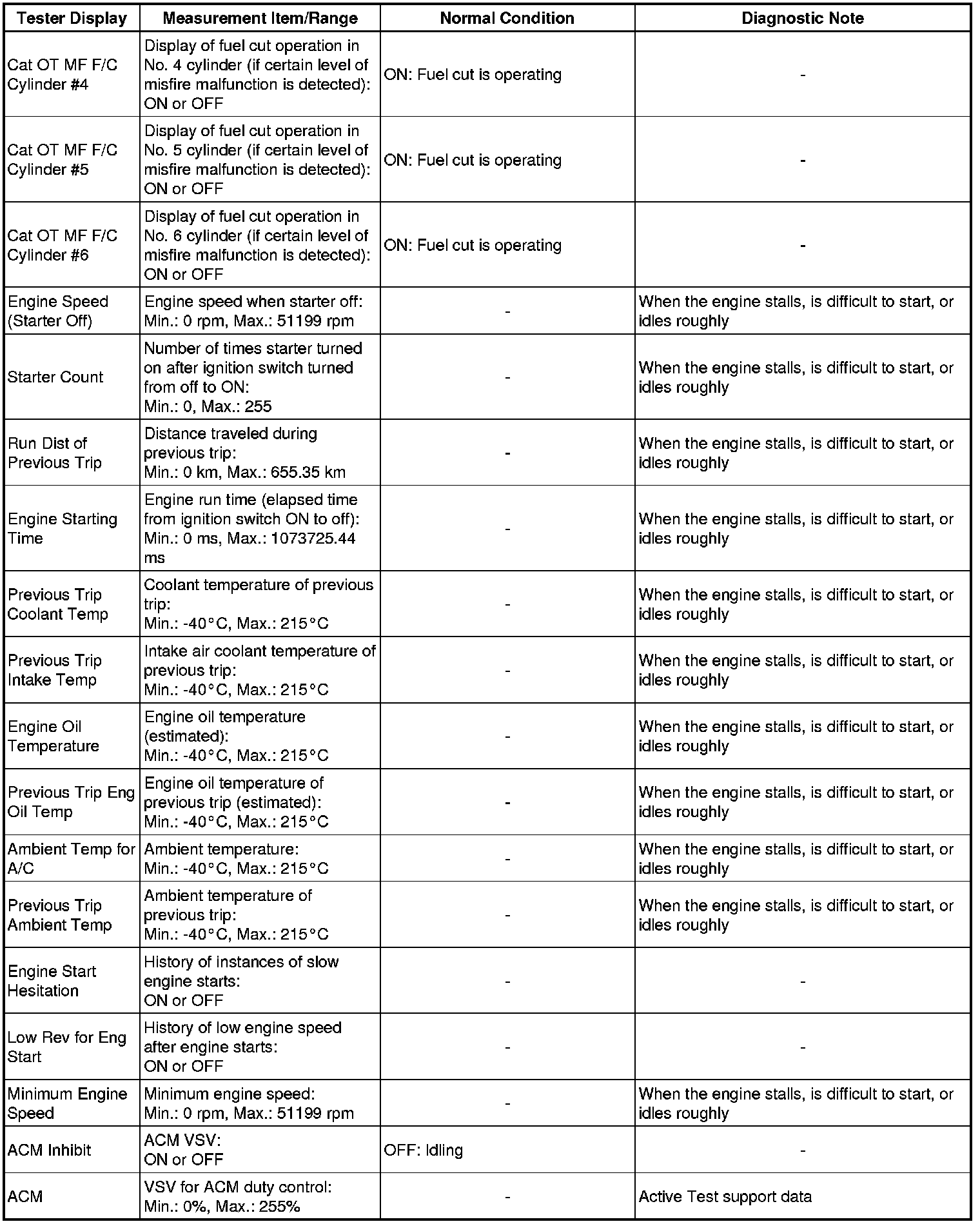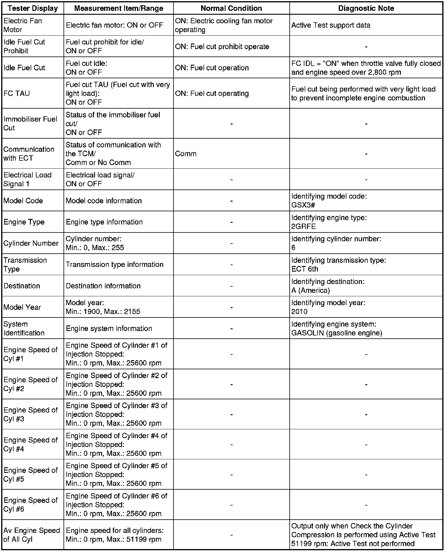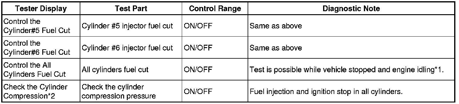 *2: While the Active Test item Check the Cylinder Compression is being performed, the fuel and ignition of all cylinders is cut. At this time, the ECM measures the speed of each cylinder while the engine is being cranked.