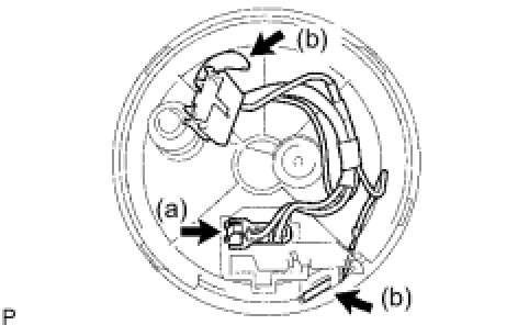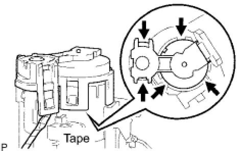 (b) Using a screwdriver with its tip wrapped with tape, disengage the 4 snap claws from the claw holes, and pull out the fuel suction plate.