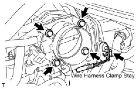 (b) Install the throttle w/ motor body assembly and wire harness clamp stay to the intake air surge tank with the 4 bolts.