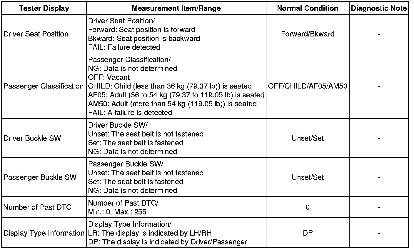 1. DATA LIST FOR CENTER AIRBAG SENSOR ASSEMBLY