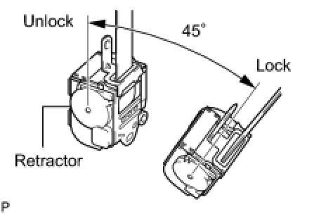 (1) When the inclination of the retractor is 15° or less, check that the belt can be pulled from the retractor. When the inclination of the retractor is over 45°, check that the belt locks.