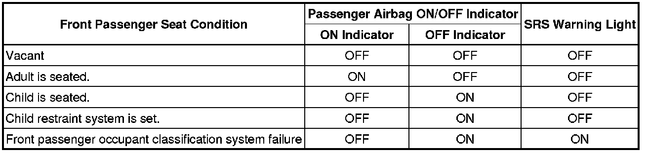 (3) Approximately 6 seconds after the ignition switch is turned to on (IG), the passenger airbag ON/OFF indicator will be ON/OFF depending on the conditions listed below.
