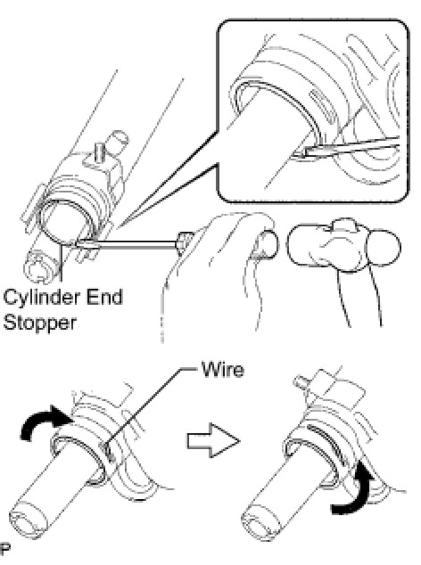 (a) Using a screwdriver and a hammer, turn the cylinder end stopper clockwise until the wire end is visible through the service hole.