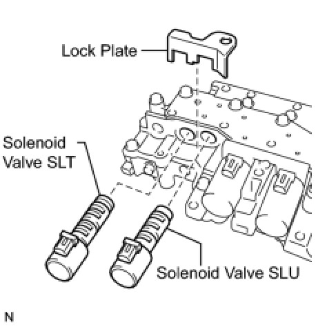 (b) Install the shift solenoid valve SLT and lock plate to the valve body assembly.