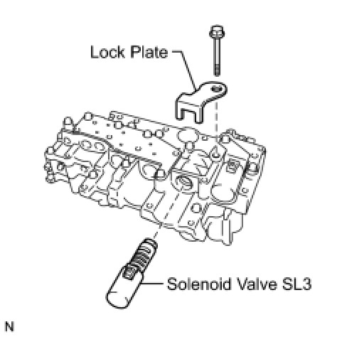 (b) Install the shift solenoid valve SL3 and lock plate to the valve body assembly with the bolt.