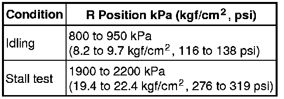 (14) Firmly depress the brake pedal, move the shift lever to D, depress the accelerator pedal all the way down, and check the line pressure while the stall test is performed.