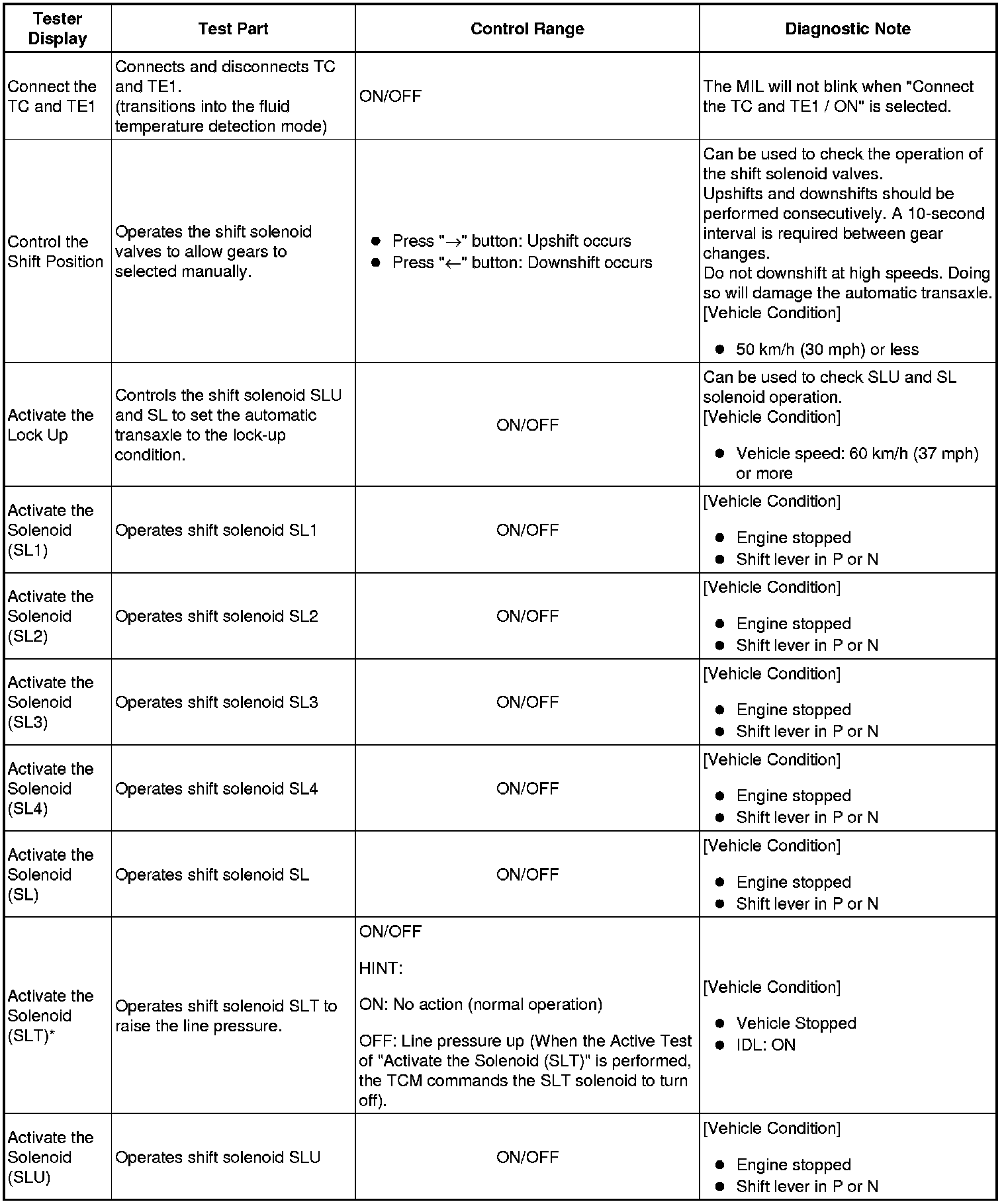 (h) *: The "Activate the solenoid (SLT)" Active Test is performed to allow confirmation that the line pressure changes. The line pressure changes are confirmed using the same SST that is used for the Hydraulic Test Hydraulic Test.