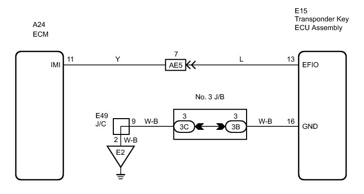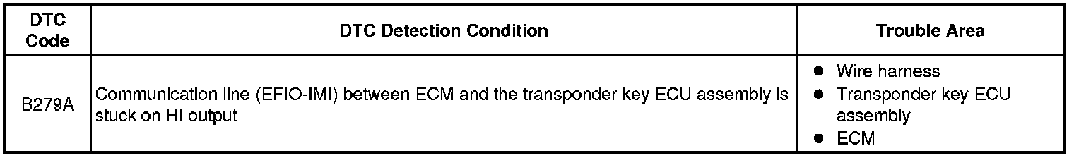 If the communication line (EFIO-IMI) to the transponder key ECU assembly is stuck on HI output, the ECM stores this DTC.