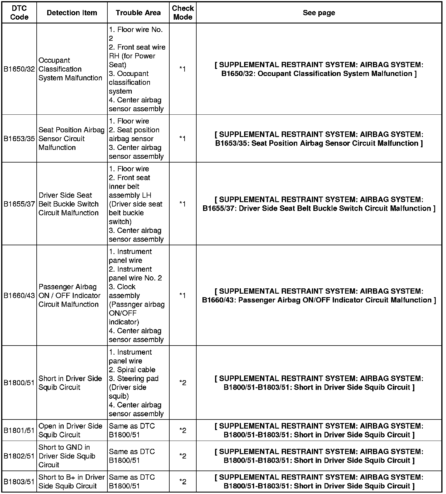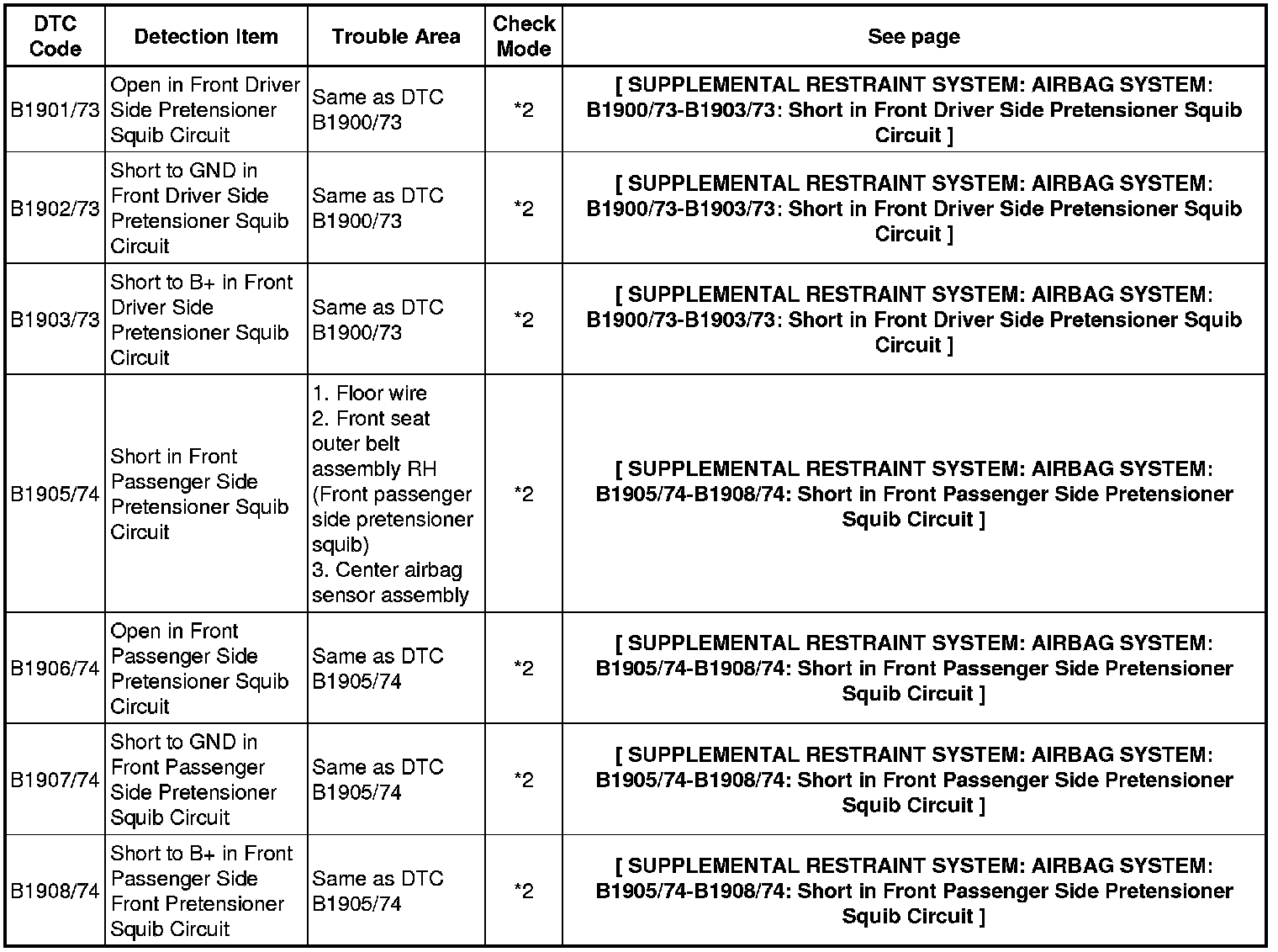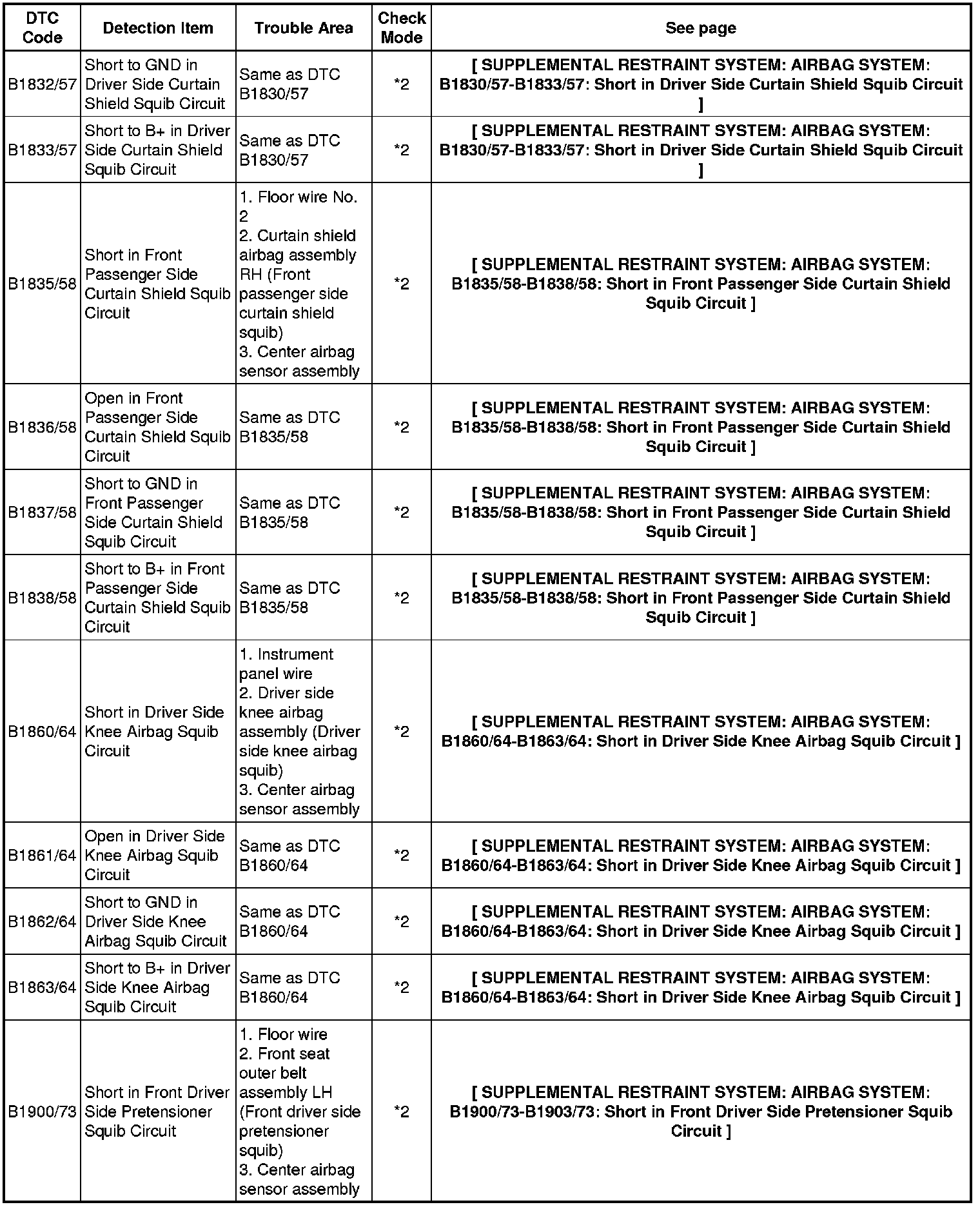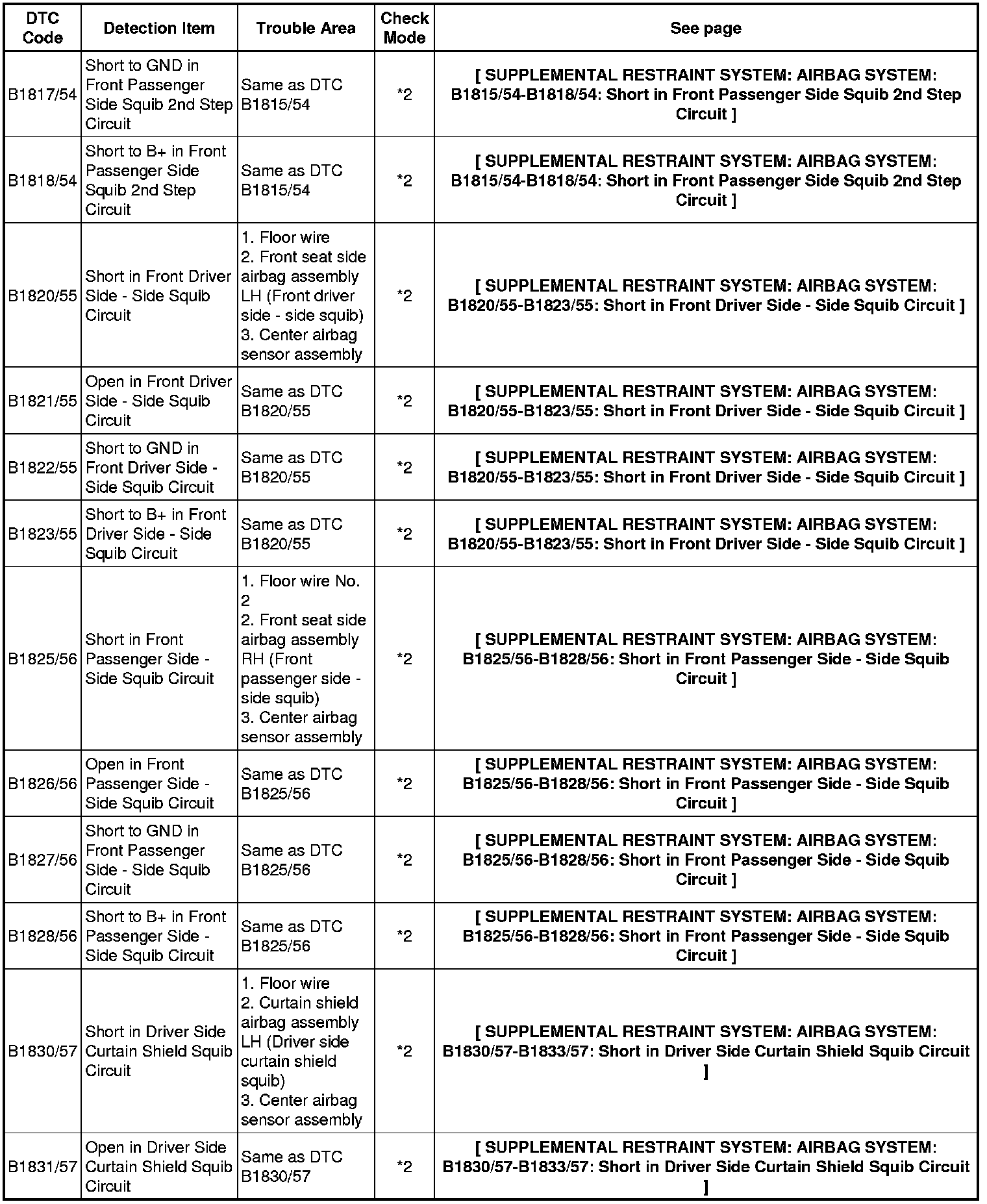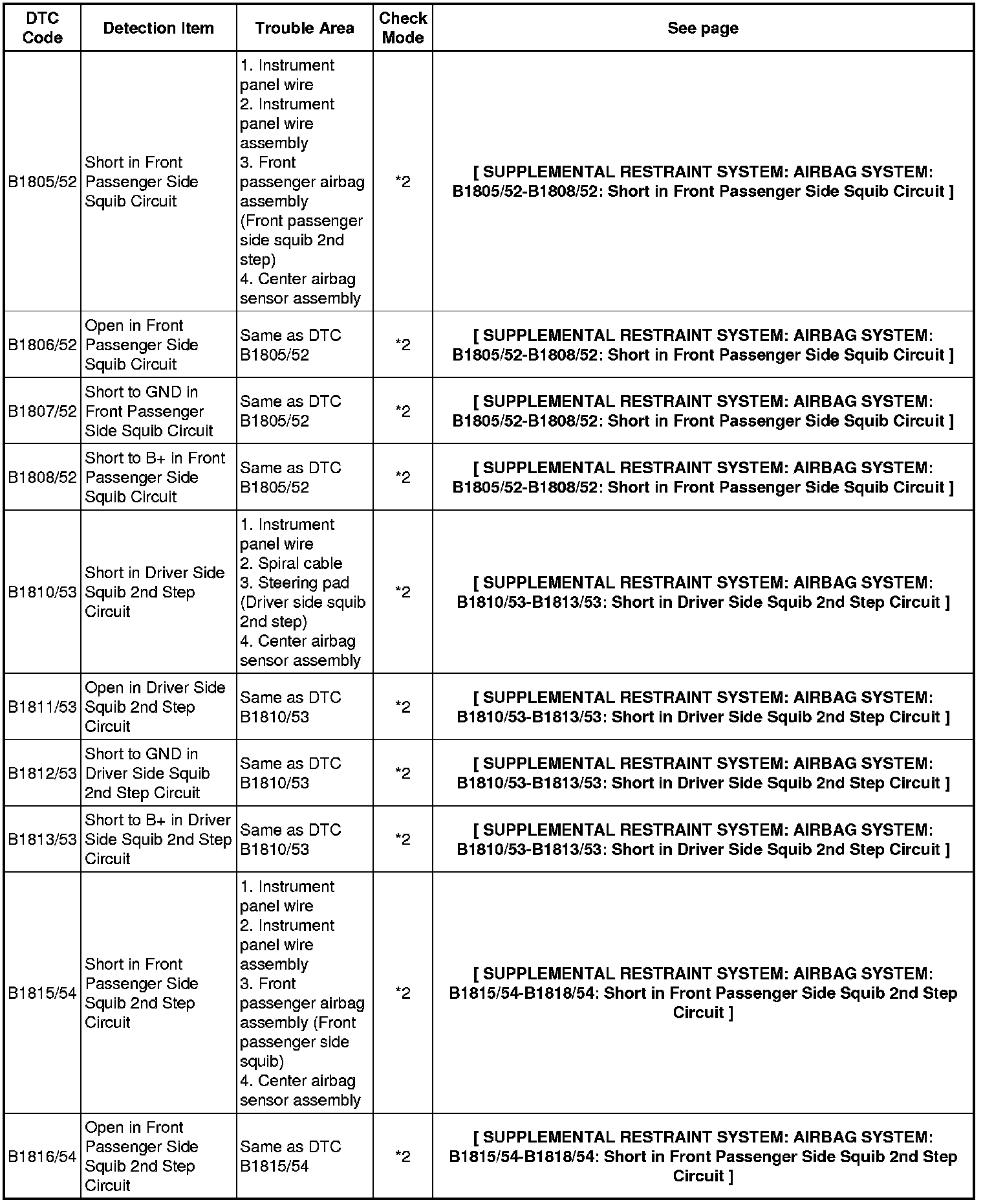 * In the case of any malfunction concerning an open circuit, short to ground, or short to B+ due to a squib, other trouble codes may not be detected. In this case, repair the malfunction currently indicated and then perform malfunction diagnosis again.