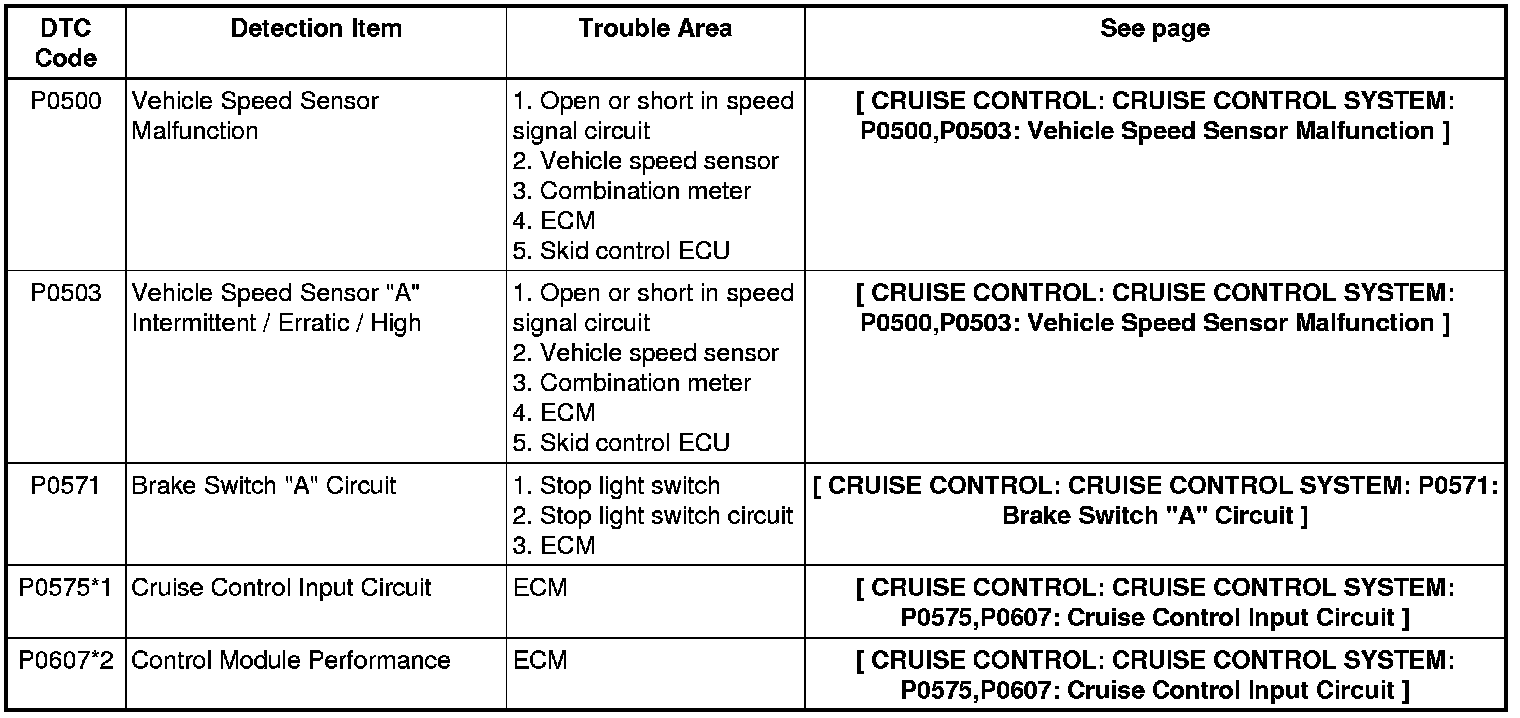 CRUISE CONTROL: CRUISE CONTROL SYSTEM: DIAGNOSTIC TROUBLE CODE CHART