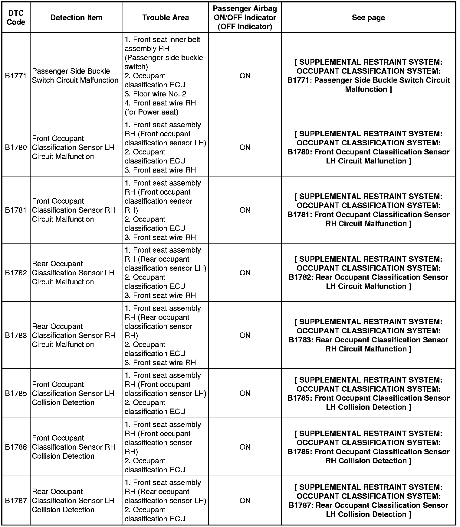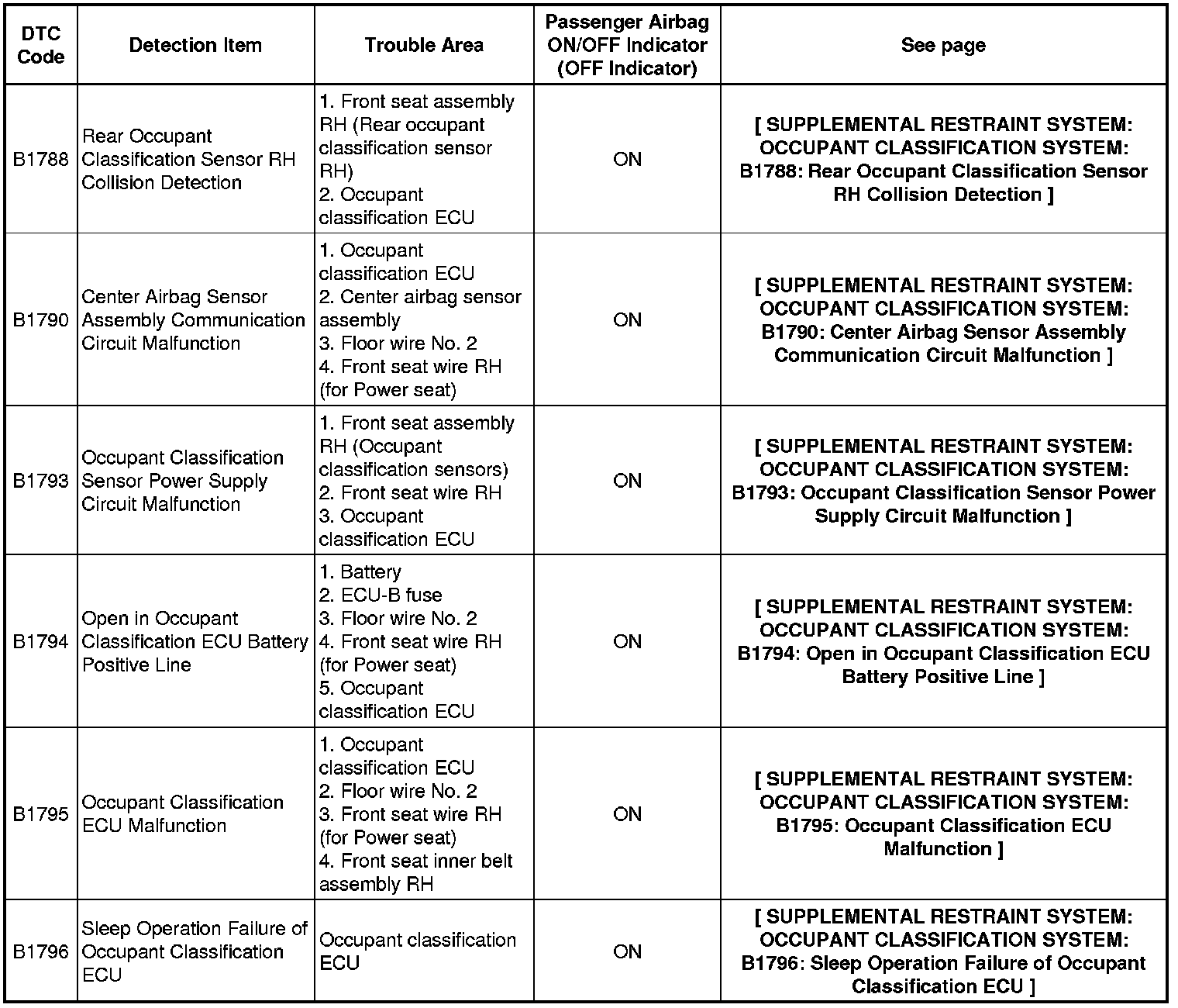 SUPPLEMENTAL RESTRAINT SYSTEM: OCCUPANT CLASSIFICATION SYSTEM: DIAGNOSTIC TROUBLE CODE CHART