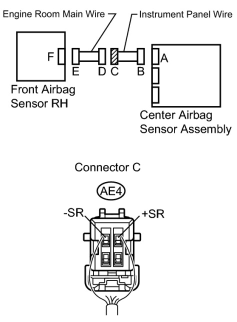 (b) Check that the connectors (on the center airbag sensor assembly side and front airbag sensor RH side) are not damaged.