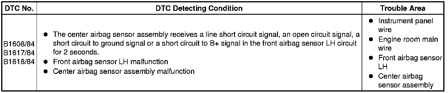 DTC B1608/84, B1617/84, or B1618/84 is recorded when a malfunction is detected in the front airbag sensor LH circuit.